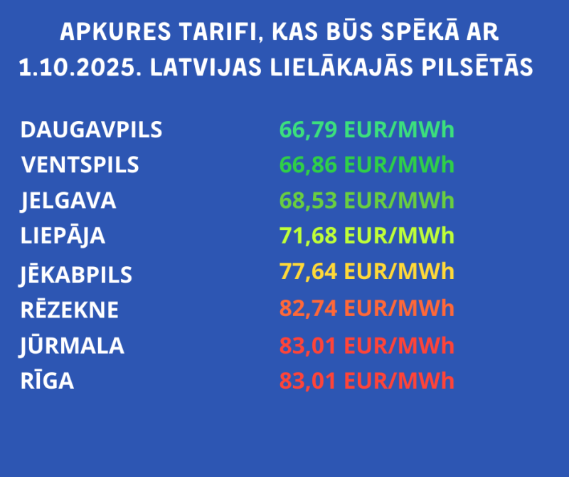 То, как даугавпилсский тариф выглядит на фоне других городов, видно из сравнительной таблицы, которую регулярно составляют на предприятии Daugavpils siltumtīkli. Тарифы на отопление в столице Латвии и соседней Юрмале, например, с октября будут составлять 83,01 евро за 1 MWh теплоэнергии.